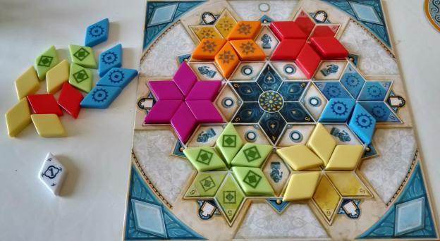 Scattered around your player board are a number of symbols. If you place tiles to completely surround these, you’ll be allowed to take 1-3 tiles (depending on the symbol) of your choice from the centre of the score board. This is the only time that the player order for placing tiles actually matters (get in early, take those high value purples, crush that tile touching tyrant). Spaces are then immediately filled from the bag.