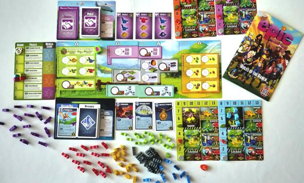 The box art is fantastic, with its bold, bright colours, outside and in. The contents follows this beautifully with 70+ wooden dinosaurs, food and supply markers for each player (1-4), and a number of ranger meeples.