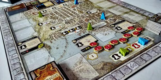 I enjoy worker-placement games immensely, and LoW takes that formula and expands it in a really interesting way. At the start of the game, there are basic locations you can visit to gain money or intrigue, acquire details of quests, hire adventurers to meet in a tavern to send on those quests, and build new locations to expand the city.