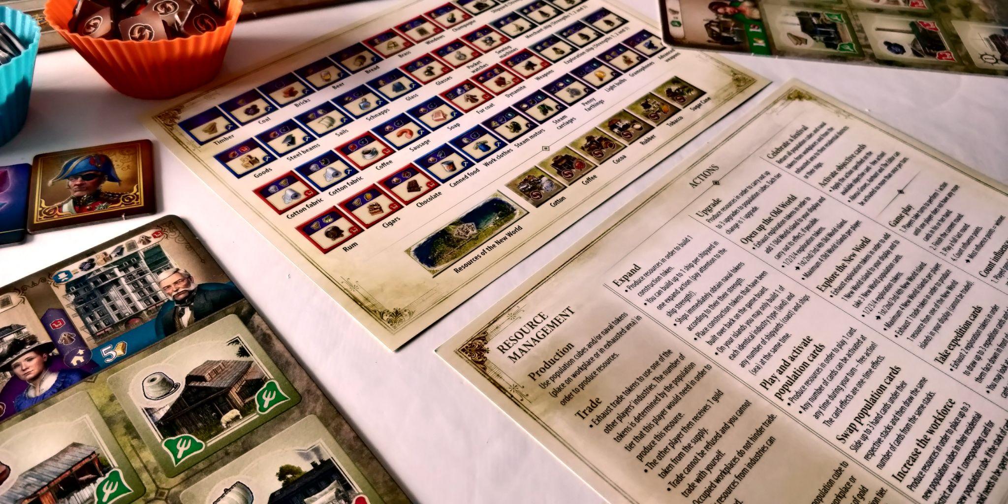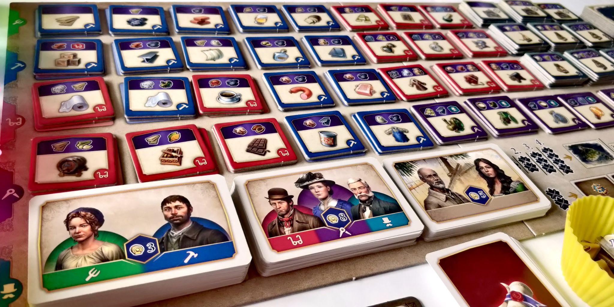 The game ends when any player has no more cards in their hand. That said, it can be very difficult to tell if ending the game is the best idea for you since victory points are mostly based on what population cards you’ve completed. With Farmer/Worker cards being worth 3 for each completed card, Artisan/Engineer/Investor cards are worth 8, and New World cards worth 5 each.