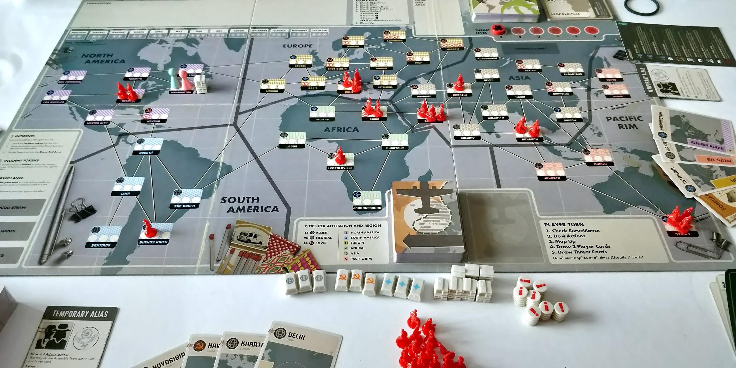 On top of all this, during the game end phase, you’ll be adding surveillance to any city with an incident token. If you start your turn in a city with surveillance you will lose that much cover on your current alias (unless there’s a safehouse).