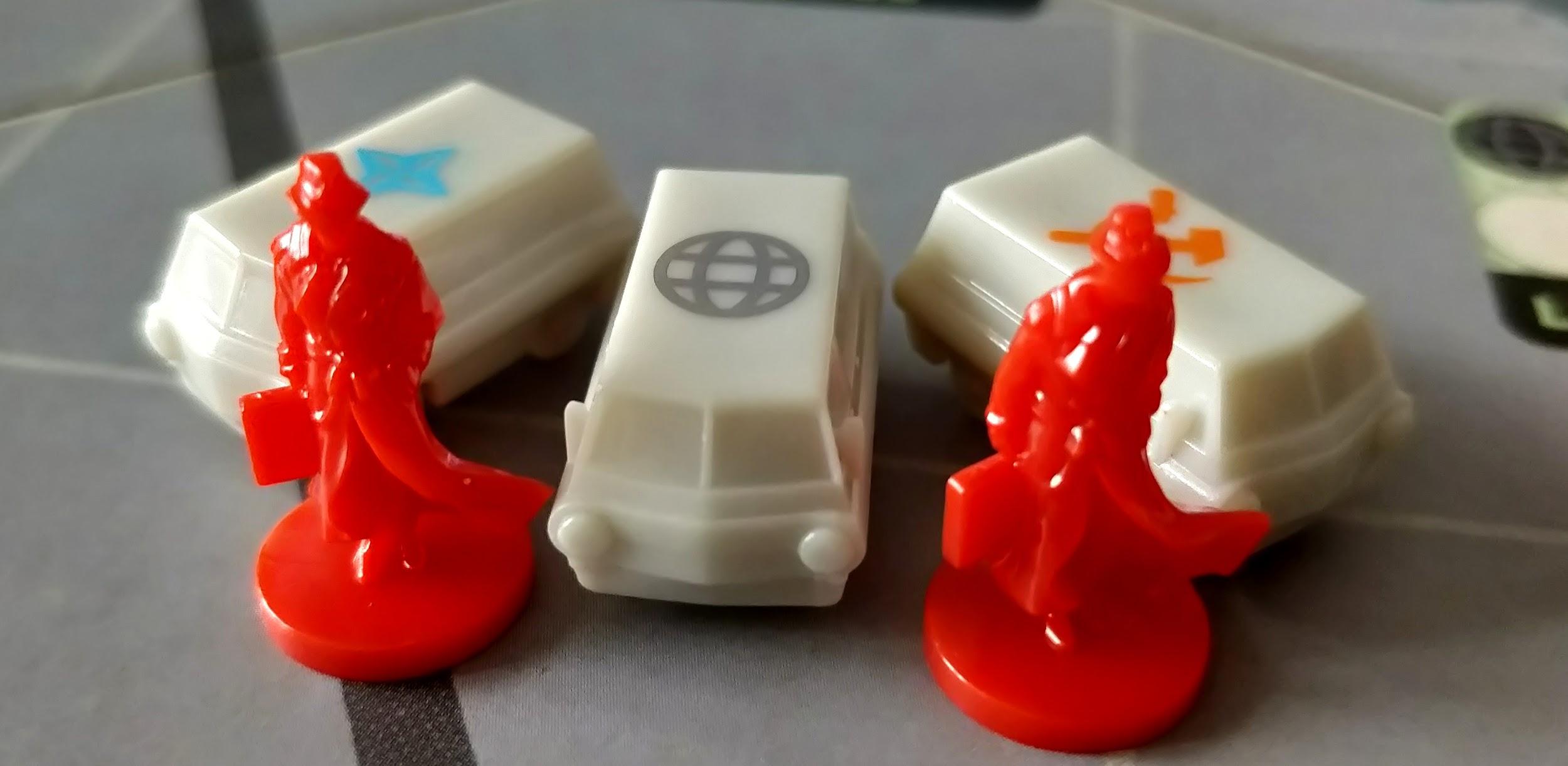 Another big change is that you can’t just fly between safehouses as you could with research stations. This immediately limits your board coverage, especially in a two player game. There are visas which can be bought with game end upgrade points, but this will only get you to the city you name on the visa.