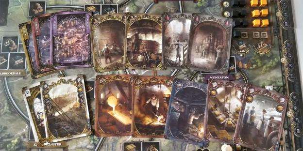 During the first part of the game, players take turns to build canal routes and factories across the English midlands. Cards showing a location allow you to build industry there, while those showing a particular industry allow you to open up a city on your network (somewhere you’ve built connections to) to this wonderous new trade.