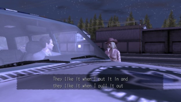 Consequently I ask myself: why is this the case? Why did SWERY want to drown out the conversation? My only conclusion so far is that York places so little value in it that he’s half in his mind just thinking of a jaunty tune. This would sit with the fact he’s a massive douchecanoe (the Director’s Cut, did change the sound balance in this scene and it was nowhere near as hilarious. Besides, they didn’t re-release the DC, they released this).