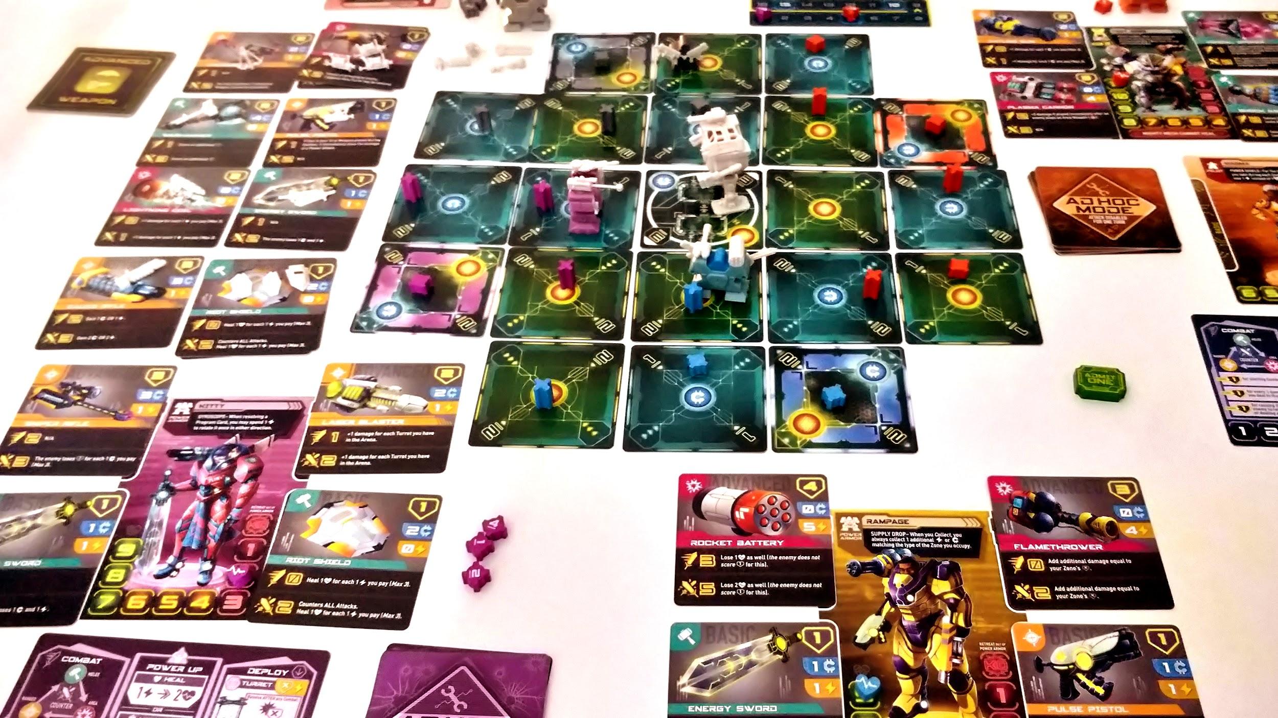 Players also get a tracker board which shows money and energy reserves, as well as acting as a cheat sheet for what actions you can take, scoring, and building costs; an itemeeple in their colour; 4 mine tokens; three turret tokens; program cards; and a set of basic weapons to select their starting loadout from.