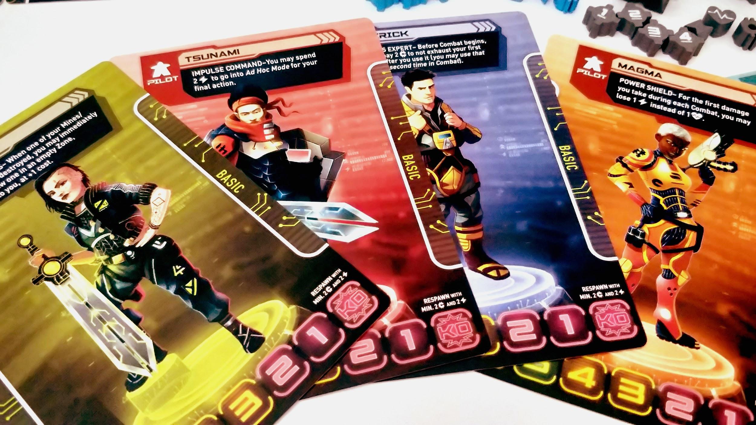 With board setup complete, players are dealt two pilot cards and will pick one to play as. Each pilot card shows the character one side and and their power-armoured mode on the reverse. Each pilot has a unique special skill that can be utilised while in character or power armour mode. This could be something like taking extra resources on collection phases or being able to change the direction of your movement (for a small fee). These cards also track the player’s health in each mode.