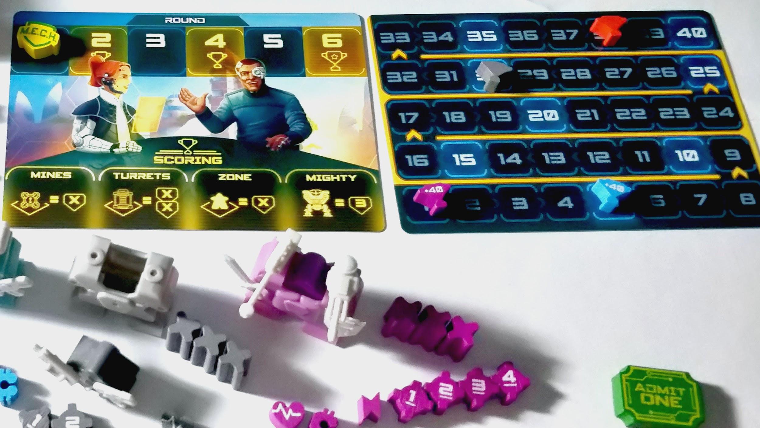Once everyone has taken their actions and the dust has settled from any fighting, play moves to the next round. Every other round is a scoring round so it’s a great time to take some extra ground. You’ll be awarded points for each mine and turret, as well as the position you’re holding (based on the number on the tile), as well as points for controlling the Mighty Mech. After 6 rounds, the final scores are tallied as per the previous round and plus extra points for the weapons you’ve acquired throughout the game.