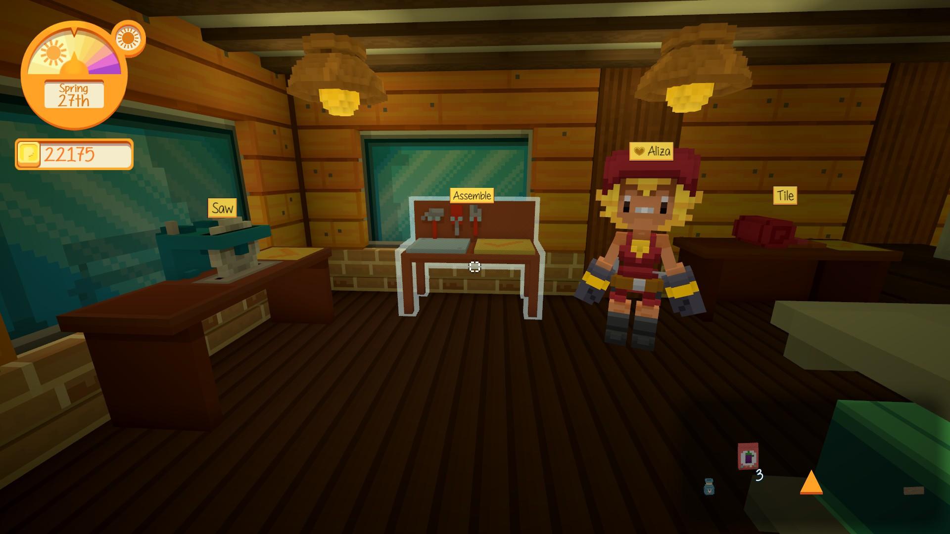 Rather than clicking on a crafting object, entering a simple GUI and throwing things from your inventory in set shapes to fashion the things you need, Staxel wants you to put things on the crafting tables by hand. Need wood? head out, find a tree, cut it down (at least cutting the bottom will make rest collapse, rather than defying gravity like in Minecraft). Take your raw wood (*snigger*) off to the building centre in town and use their saw table by putting wood from your hand, onto the table and then activate the saw. From here it will keep going until it runs out of wood or you stop it and grab your freshly hewn lumber. Because the saw table is good and the others – which make you craft one unit at a time – are awful and should learn by saw table’s excellent example.