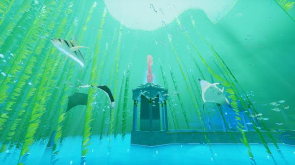 Exploration is basically, this thing has an orange bit over it that suggests I can interact with it, let’s see… Oh, turtles flew out of this circle of coral, somehow. That’s, good(?). What’s that statue down there? Huh, seems I can meditate there and follow a fish around for a while. Pushing the left stick will switch which species you’re stalking with your mind. How very tranquil. Or creepy, depending on how you feel about following unsuspecting underwater fauna.