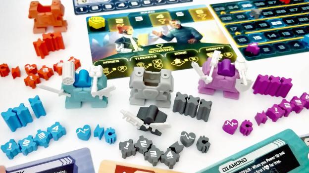 Once everyone has taken their actions and the dust has settled from any fighting, play moves to the next round. Every other round is a scoring round so it’s a great time to take some extra ground. You’ll be awarded points for each mine and turret, as well as the position you’re holding (based on the number on the tile), as well as points for controlling the Mighty Mech. After 6 rounds, the final scores are tallied as per the previous round and plus extra points for the weapons you’ve acquired throughout the game.