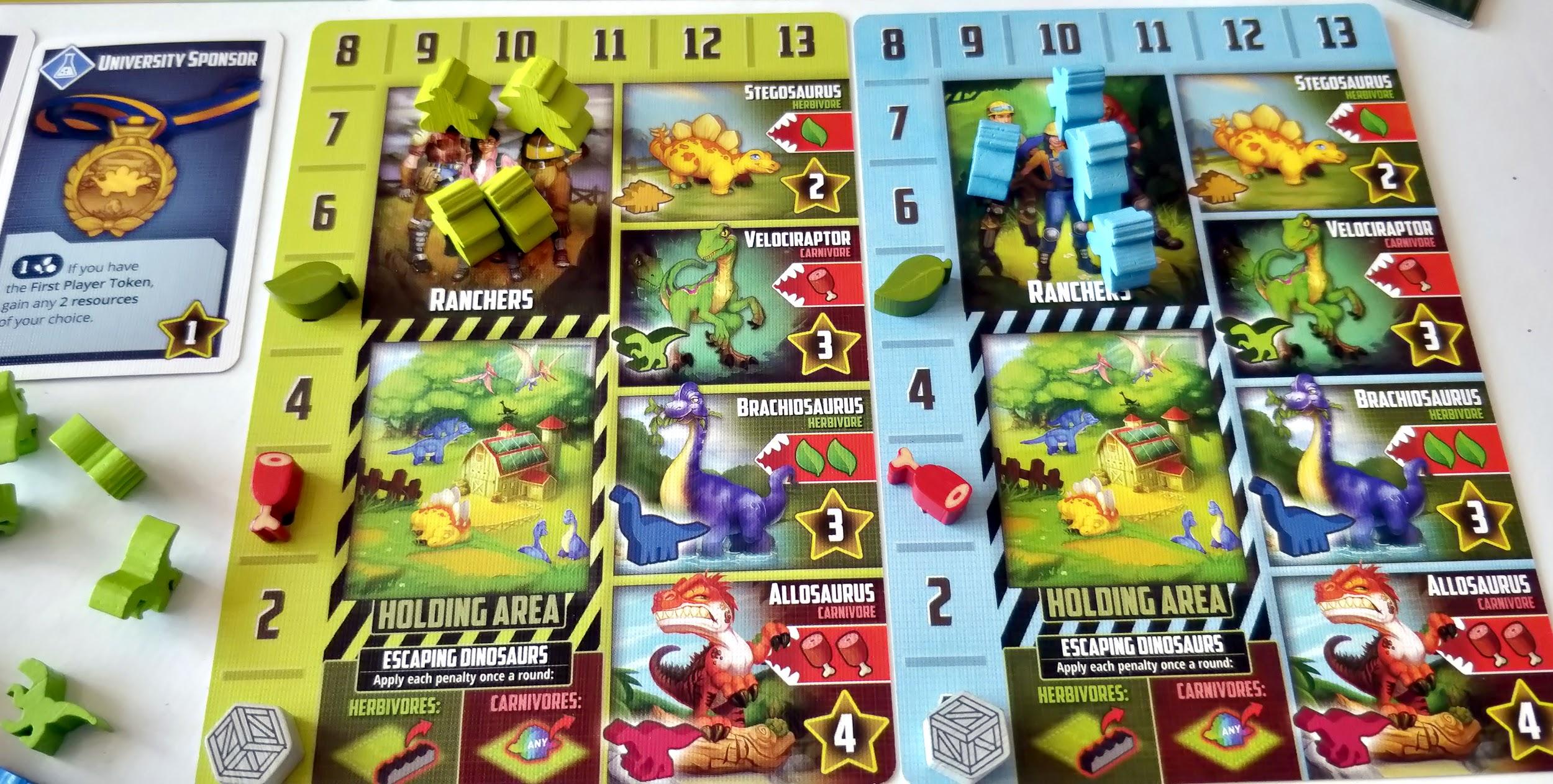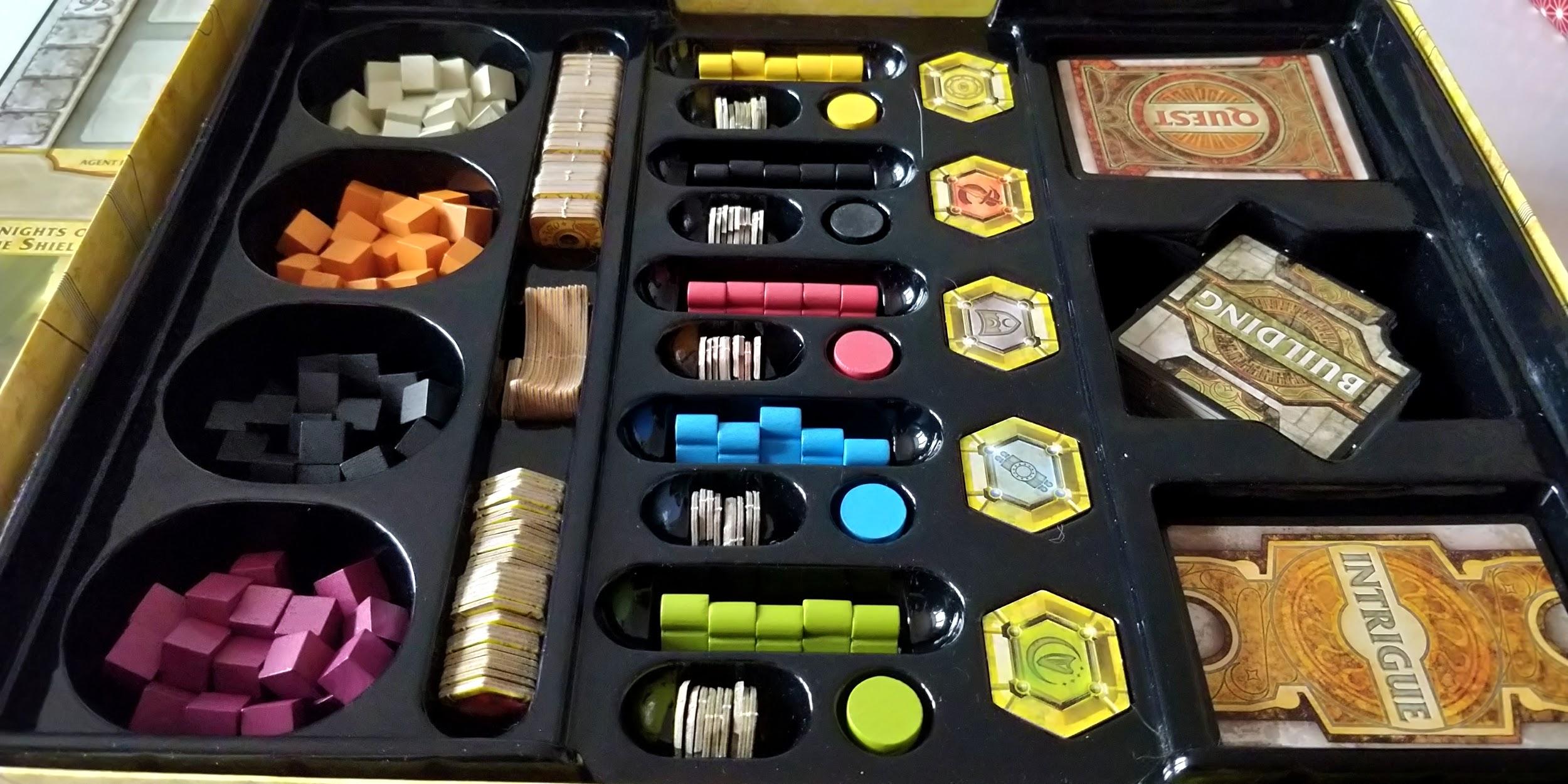 Finally, move the round token one space and hand the first player token to the next player clockwise and start a new day. At the end of four rounds, add together any end game bonuses from tiles, and one point for every three coins in your coffers.